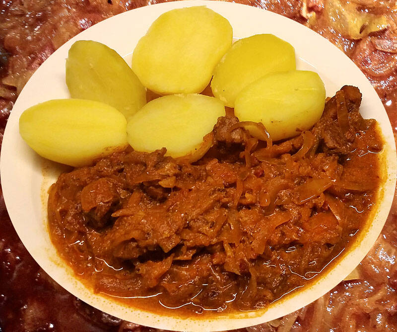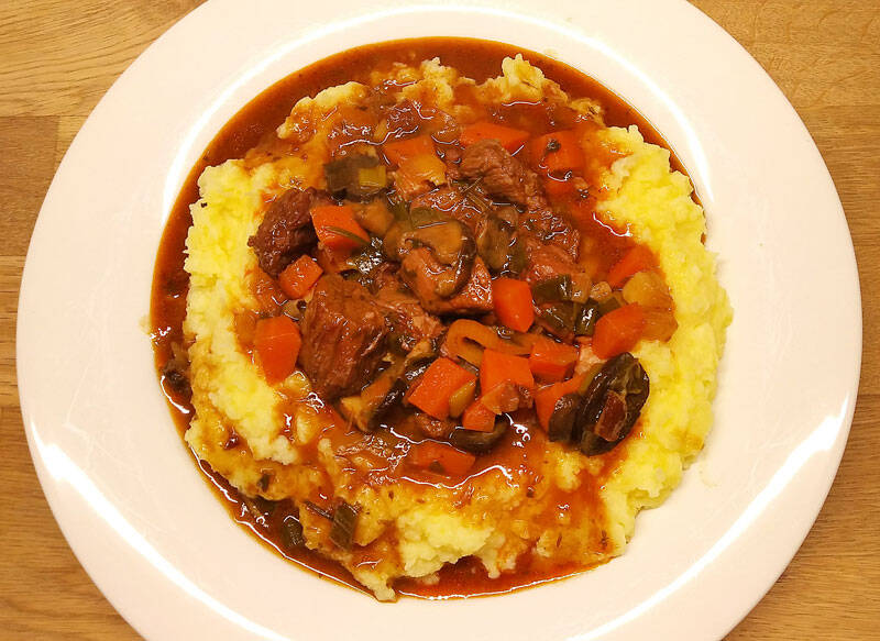 Das Bauchfleisch und das Kartoffel-Pilz-Gemüse zu dem Rindfleisch geben und nochmals ½ Std. köcheln lassen.