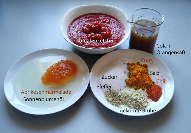 Öl, Tomatenketchup, Orangensaft, Cola und Aprikosenmarmelade in einen Topf geben und erhitzen. Mit Currypulver und Cayennepfeffer vorsichtig würzen, lieber nachwürzen.