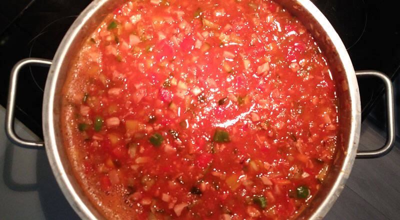 Den Speck anbraten, das gewürfelte Kassler und die Fleischwurst dazugeben und anbraten, die Zwiebeln mit in den Topf geben und weiter braten, bis die Zwiebeln glasig sind. Falls es ansetzen sollte, ein wenig Wasser dazugeben. Nun die gewürfelten Paprika, die Tomaten, das Tomatenmark und den zerdrückten Knoblauch dazugeben.