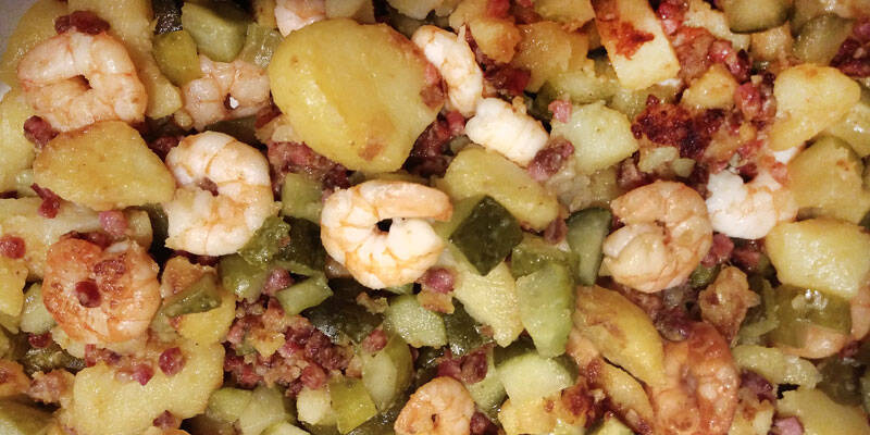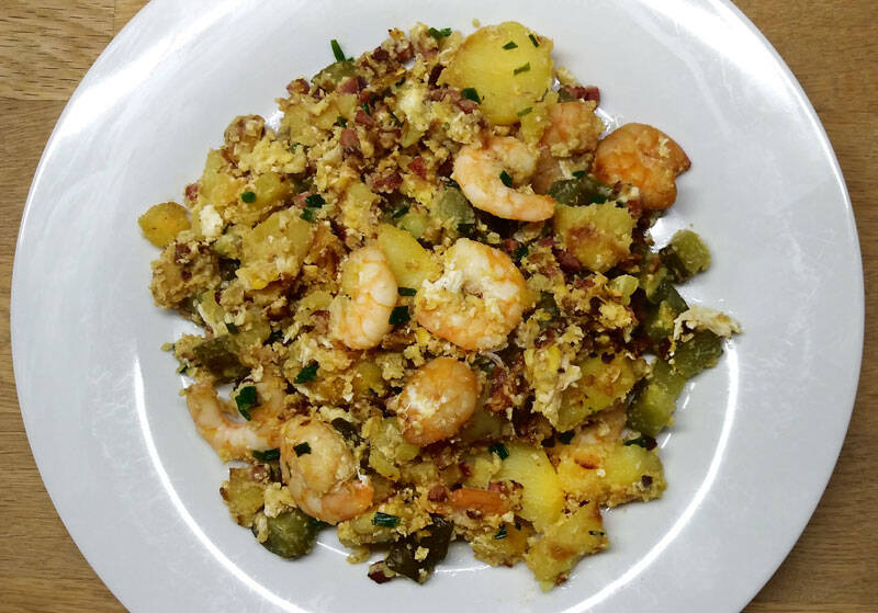 Kartoffeln dazu geben, salzen und rundherum knusprig braun braten. Abgetropfte Krabben und gewürfelte Gewürzgurken reinmischen. Aufgeschlagene Eier zugeben, verrühren und stocken lassen. Schnittlauch darüber streuen und servieren.